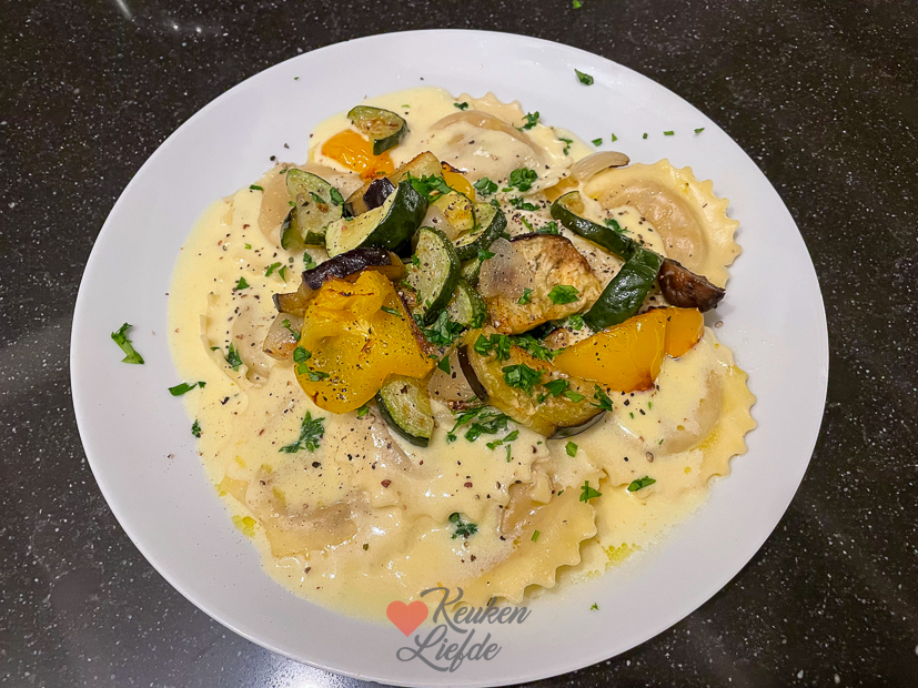 Het is de eerste dinsdag van het nieuwe jaar, de tweede week van de kerstvakantie. In de ochtend zit ik op kantoor om het Kijkje in de keuken te schrijven en te publiceren. Johan is ondertussen bezig om het nieuwe wastafelmeubel op de kamer van Ella-Marie op te hangen. De rest van de dag rommelen we lekker wat aan. Eind van de middag breng ik Ella met vriendinnen naar een vriendinnetje uit hun klas waar ze gaan eten. Johan en ik eten dus met z’n tweeën vanavond. Op het menu staat pompoenravioli met botersaus en gegrilde groenten uit de oven.