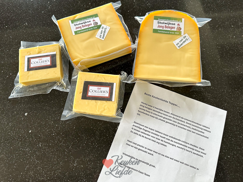 Ik krijg ’s middags lekkere kaas binnen van onze partner Hoogendoorn Kaas. Elke maand maken we een lekker recept met één van hun kazen of producten en dit keer krijg ik de Stolwijkse jong belegen en de Collier’s cheddar opgestuurd om iets lekkers mee te maken. Dat gaat zeker lukken! Het recept met de jong belegen ga ik deze maand nog met je delen en het recept met de cheddar ga ik in juni met je delen. Bekijk hier alle Hoogendoorn recepten die ik tot nu toe maakte.
