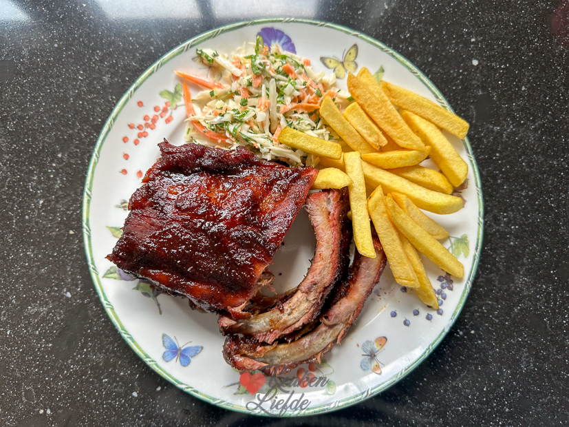 Terwijl ik de kantjes ervan afrijd, is Johan bezig met de spareribs voor het avondeten. Hij gebruikt dit recept, alleen liet hij de appelsap dit keer achterwege en voegde wat boter, agavestroop en bruine suiker toe. Kom maar doorrrrrr met die calorieën! Maaien maakt hongerig. Om toch wat vitamientjes binnen te krijgen maakte ik er nog een lekkere coleslaw bij (dit recept) en de frietjes maakten het smulfeest compleet. De witte kool voor de koolsalade sneed ik in een handomdraai met de mandoline van Kitchen Royal. Hiermee kun je op 5 verschillende standen ingrediënten snijden, zowel in plakjes als julienne. Naderhand kun je hem eenvoudig demonteren en afspoelen onder de kraan, of je zet hem in de vaatwasser. Echt een aanwinst in de keuken als je mij vraagt.