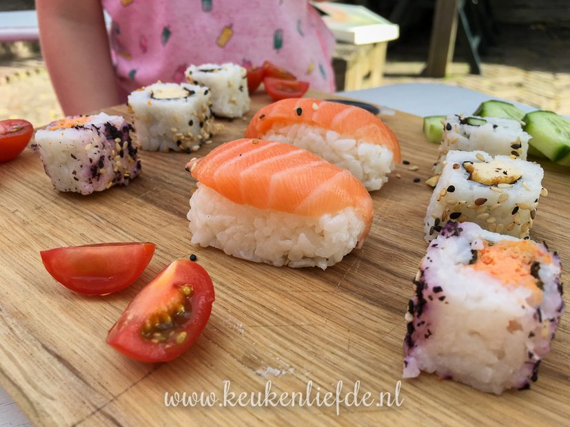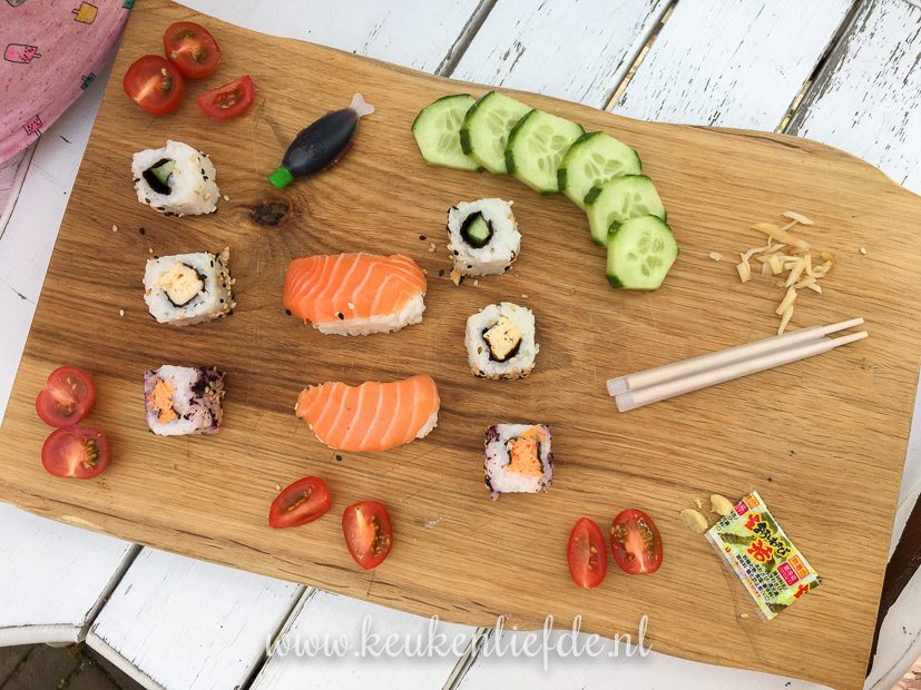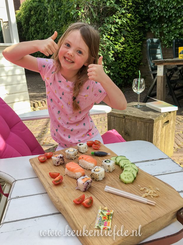 Johan komt morgen weer thuis, dus Ella-Marie en ik eten nog een keer met z’n tweeën. Tijdens het boodschappen doen ziet El sushi liggen en stelt voor om dat te eten. Ik vind het helemaal prima voor een keertje. Het is warm en ik heb helemaal geen zin om te koken. Trouwens, sushi kun je natuurlijk ook zelf maken, mocht je daar zin in hebben. Hier vind je het recept.
