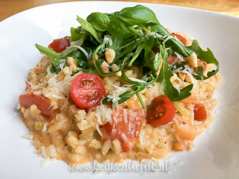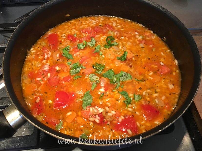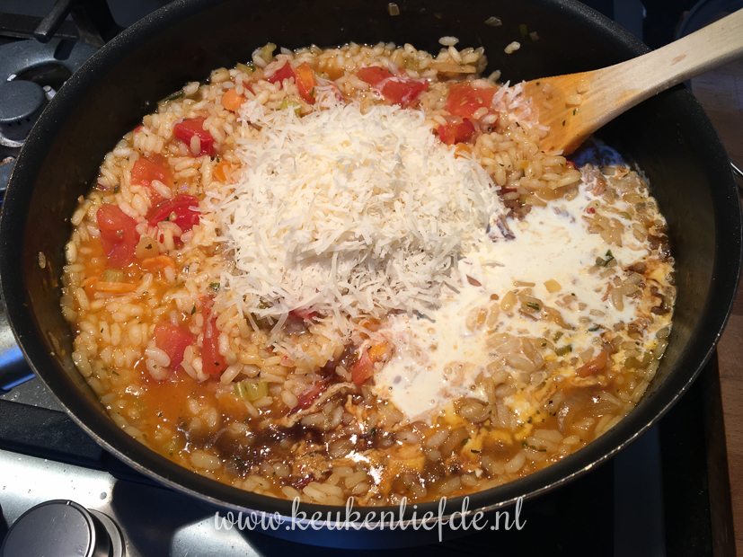 ’s Avonds maak ik tomatenrisotto. Ik gebruikte dit recept als basis, maar voegde nog extra bleekselderij en wortel toe die ik mee fruitte met de ui. De mozzarella liet ik weg en ik bracht de risotto op smaak met een flinke scheut room, Parmezaan, een snuf suiker en een scheut balsamicoazijn. O, en in plaats van afblussen met rode wijn gebruikte ik droge witte wijn. Lekkerste tomatenrisotto ooit! 🙂