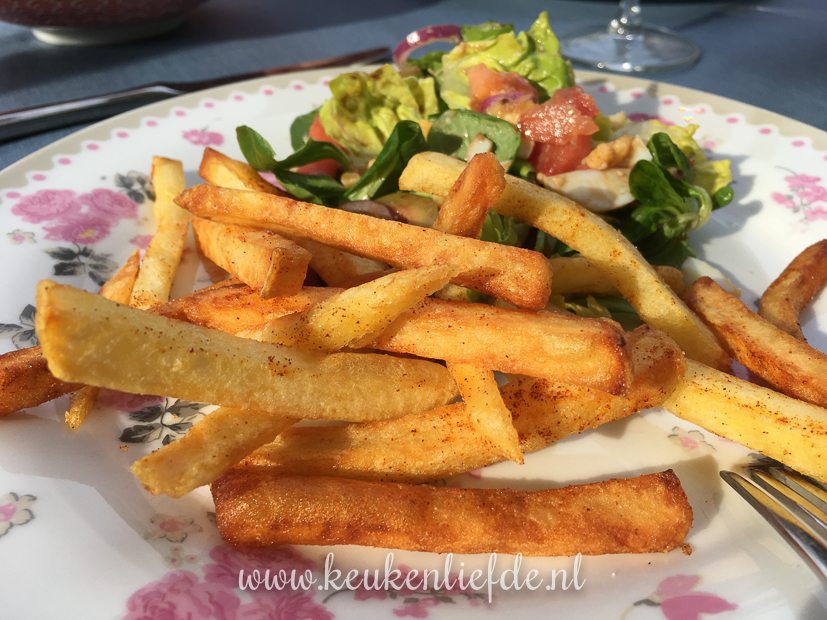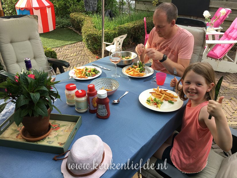 ’s Avonds eten we zelfgemaakte friet en salade.