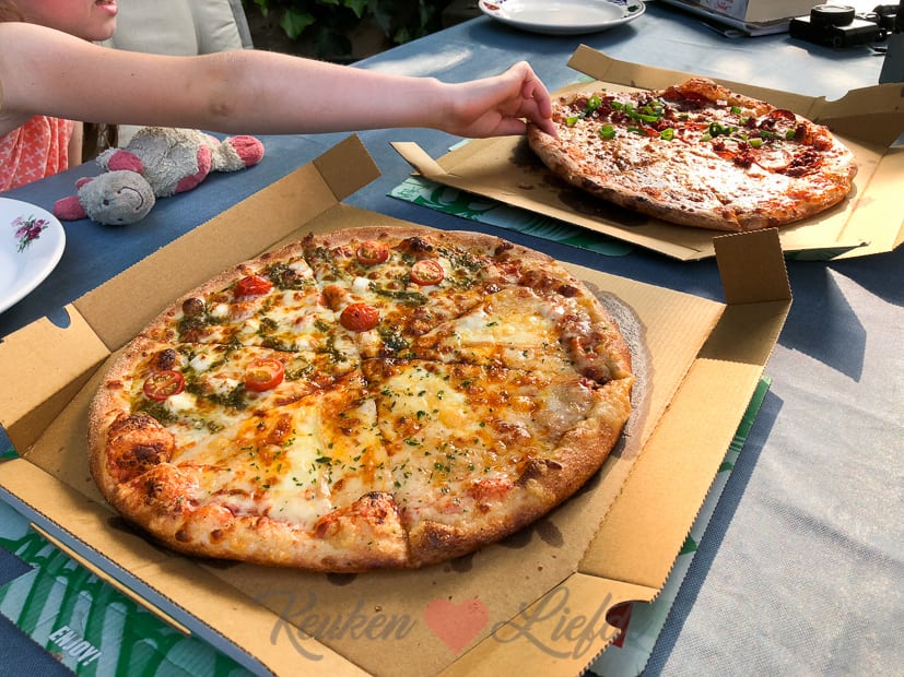’s Avonds hebben we geen zin om te koken en laten we twee pizza’s bezorgen die we lekker buiten in de tuin opeten.