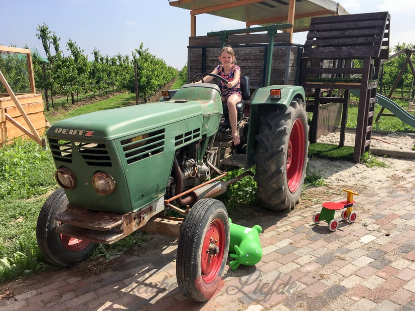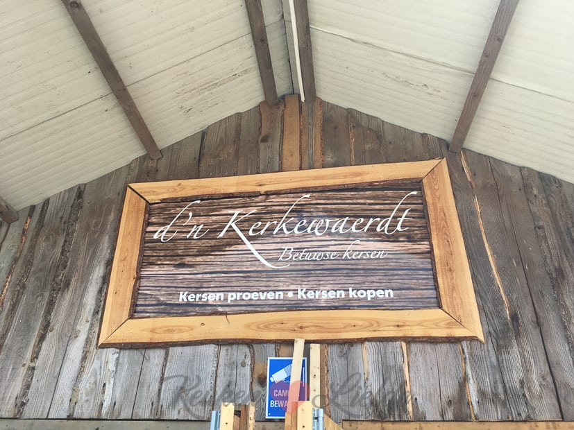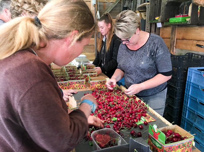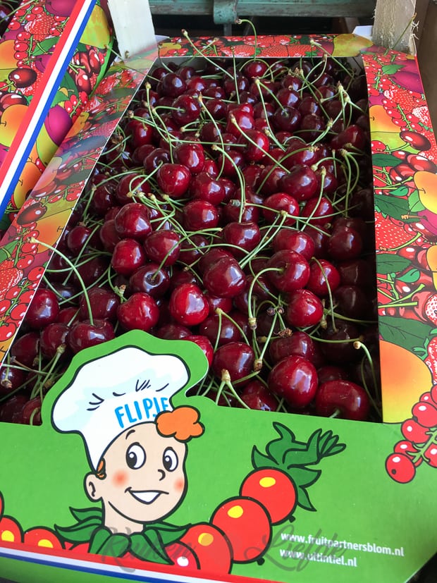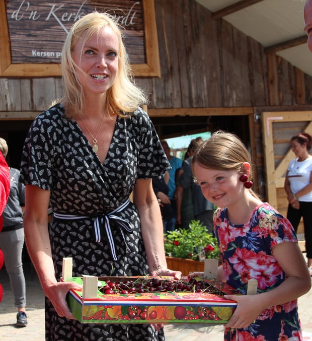 Als ik klaar ben met koken en fotograferen ruim ik snel de keuken om en spring onder de douche. Daarna trek ik een zwierig jurkje aan en haal mijn dochter uit school. Samen rijden we naar kersenboomgaard D’n Kerkewaerdt in Wadenoijen waar we samen met de burgemeester van Tiel Hans Beenakker het allereerste kistje Betuwse kersen in ontvangst mogen nemen. Wat een eer!
