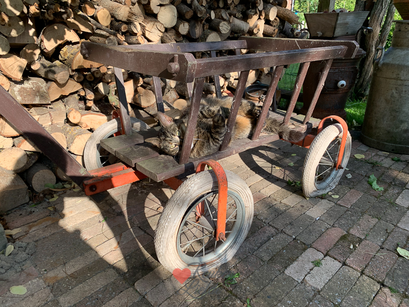 - Marie in de oude bolderkar waar ik en mijn broers vroeger in vervoerd werden.