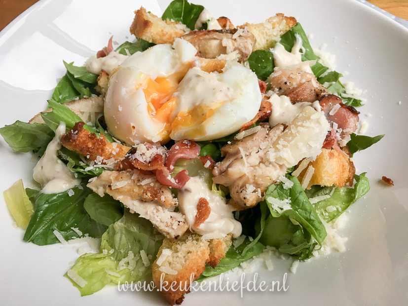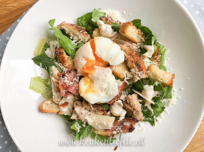 We eten caesar salade met kippendijen, spek en ei. Ik ben dol op caesar salade. Ik eet het graag op dagen dat ik niet zoveel zin heb om te (uitgebreid) koken, maar wel lekker wil eten. Dit recept ga ik binnenkort met je delen. Wil je niet zolang wachten? Eerder deelde ik al het recept voor de klassieke caesar salade (zonder kip) en een caesar salade met kipfilet (dikke aanrader!).