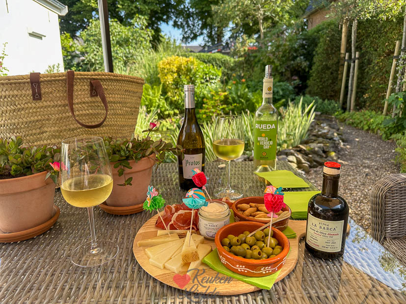 Gisteren werd er een mooi borrelpakket bezorgd van Rueda omdat het vandaag (vrijdag) Wereld Verdejo Dag is. En omdat het snikheet is besluiten we op tijd te stoppen met werk en vroeg aan de vrijdagmiddagborrel te gaan. Ik bakte ook nog wat lekkere breekbroodjes af om erbij te serveren. Het avondeten sloegen we uiteindelijk over.