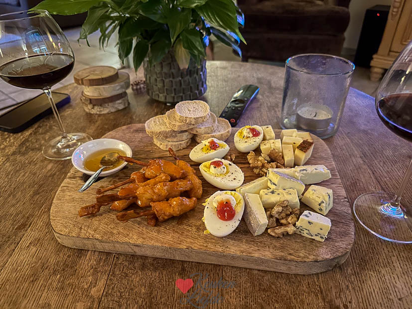 Op zaterdag moesten er boodschappen gehaald worden en maakte ik het huis schoon. Johan ging boven nog een paar uurtjes klussen. ’s Avonds warmde ik de kip parmezaan van gisteren opnieuw op voor het avondeten en later op de avond kwam er nog een borrelplankje op tafel bij de tv.