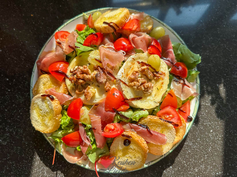 Recept: Doe twee handjes slamix op je bord. Twee plakken geitenkaas op bakpapier in airfryer met wat druiven ernaast en sneetjes stokbrood bedrizzled met olijfolie. Geitenkaas drizzle ik honing over en beleg met handje walnoten en tijm. Bakken op 200 graden tot stokbrood licht goudbruin is en geitenkaas zacht maar nog wel stevig is. Bovenop salade leggen. Afmaken met blokjes tomaat en parmaham, drizzle olijfolie en balsamicostroop. Lekker en klaar in 15 minuten!