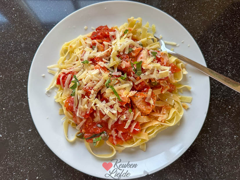 Ik heb vorige week weer lekker in de keuken gestaan om nieuwe recepten voor de website te maken. Op dinsdag maakte ik zalm uit de oven in tomatensaus die ik ’s avonds opnieuw opwarmde voor het avondeten. Ik kookte er wat pasta bij. Dit recept viel bij iedereen goed in de smaak.
