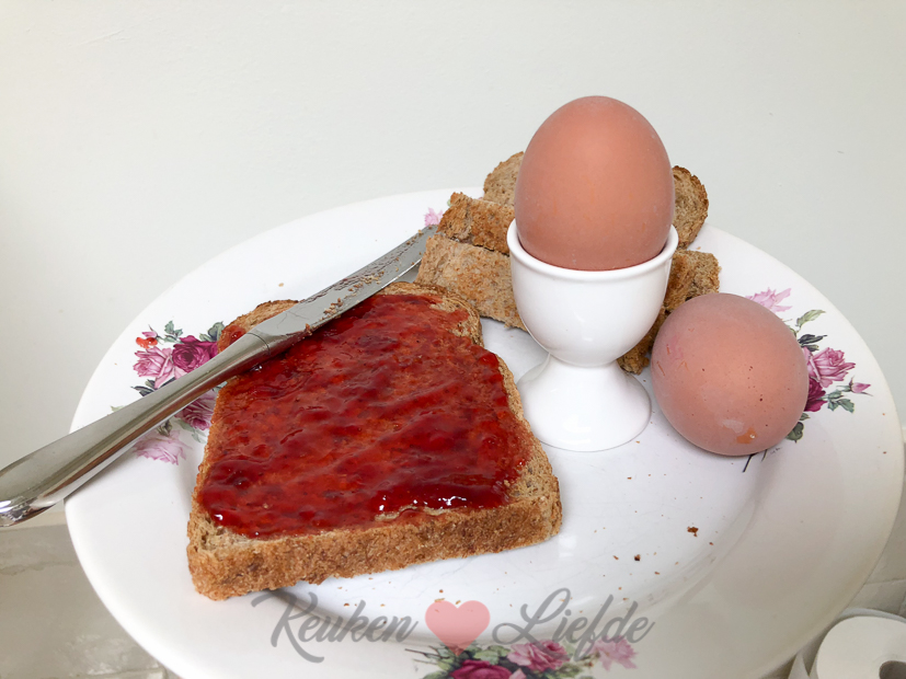 We slapen lekker uit en daarna gaan Ella en ik ontbijten. Johan gaat ondertussen 6 km hardlopen. Als hij weer terug is gaat hij douchen en maakt hij dit ontbijtje voor zichzelf.