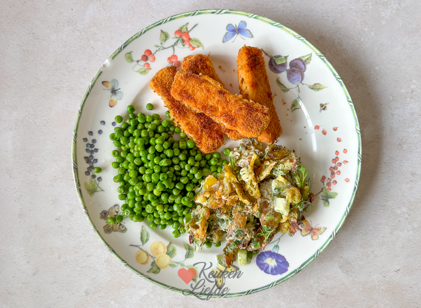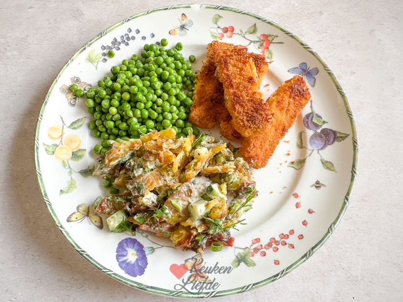 Man wat was dit lekker! Ik snap de hype nu wel. Het recept ga ik snel met je delen. Johan is zo lief om daarna de keuken voor me op te ruimen zodat ik het recept kan uitschrijven. De crispy potato salade is ’s avonds ons avondeten met vissticks en doperwten erbij.