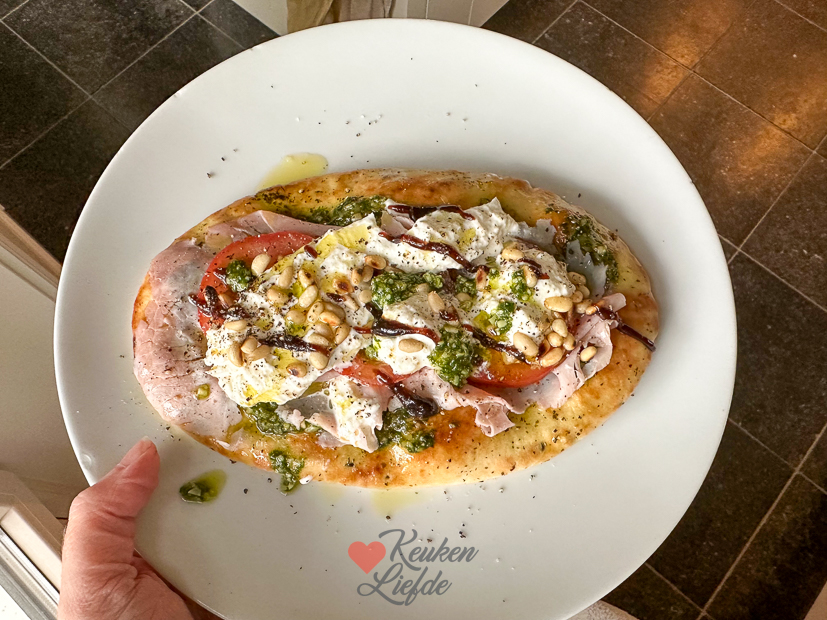 - Naanbrood met pesto, ham, tomaat en burrata
