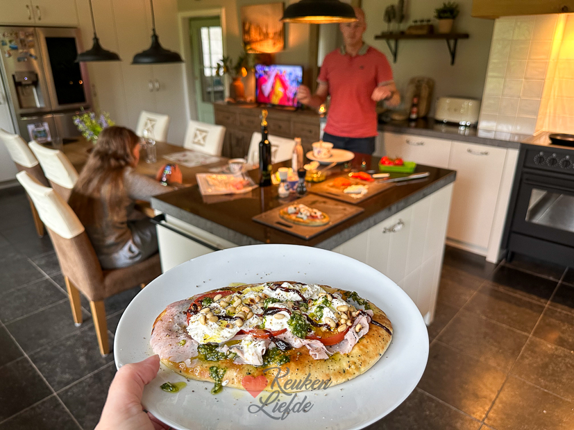 Op de terugweg halen we een boodschapje voor het avondeten en kaas en een ijsje bij de boerderijwinkel. Weer thuis gaat de tiener leren voor de toetsweek volgende week. Ik pak de stofzuiger en Johan maakt het avondeten. Er staat groentesoep met gehaktballetjes en naanbrood met pesto, ham, tomaat, burrata en pijnboompitten op het menu. Dit recept.