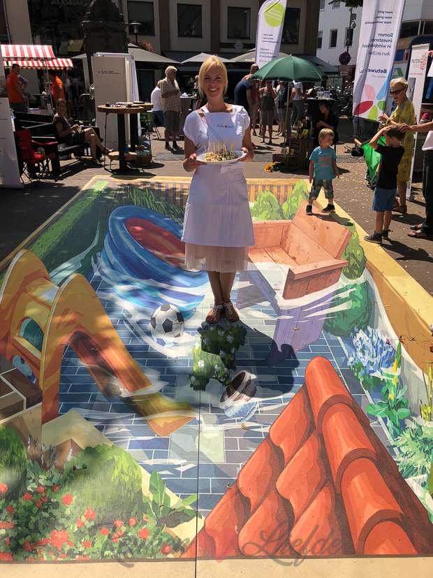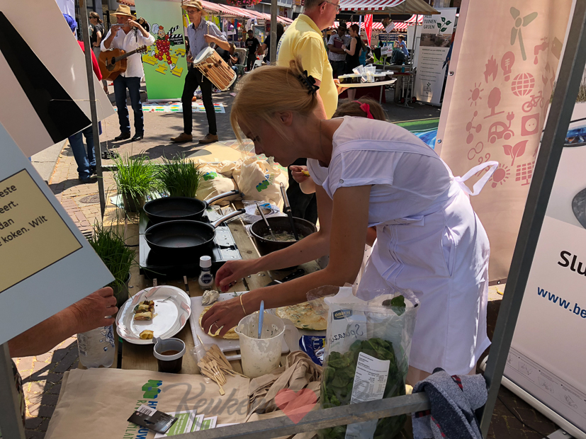 We konden niet zolang blijven want ’s middags had ik beloofd een kookdemo te geven op de Woonmarkt in Tiel. Het thema was duurzaam wonen met als speerpunt aardgasvrij wonen. Ik kookte dus niet op gas maar op inductie. Ik kook zelf thuis nog op gas maar in ons nieuwe huis wil ik zo snel mogelijk de overstap maken naar inductie. Inductie kookt erg fijn: het is snel, nauwkeurig in te stellen, veilig voor kinderen en niet geheel onbelangrijk, makkelijk schoon te maken. Ik maakte trouwens opgerolde spinaziepannenkoeken, belegd met bieslookroomkaas en gerookte zalm. Ella-Marie deelde ze uit en en kon het niet laten er zo nu en dan een in haar eigen mond te stoppen. Haha! Het recept ga ik nog delen op KL natuurlijk.