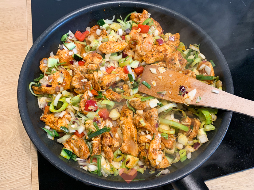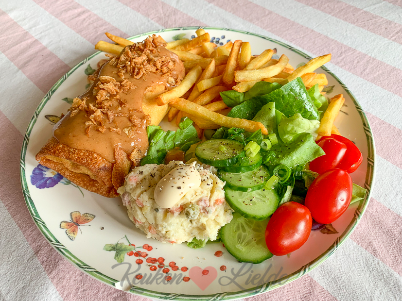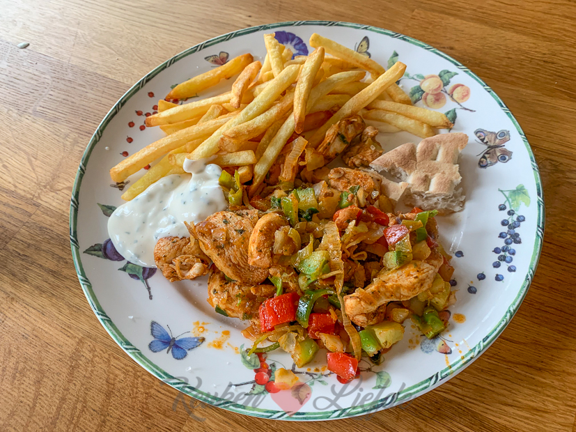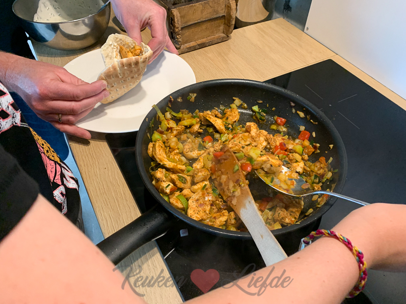 ’s Avonds eten we pitabroodjes met zelfgemaakte kipshoarma (gesneden kipfilet mengen met shoarmakruiden, wat zout en een scheutje olijfolie en minimaal 15 minuten laten marineren) die ik bak met een zak gesneden wokgroenten. Erbij wat frietjes uit de airfryer en zelfgemaakte knoflooksaus.