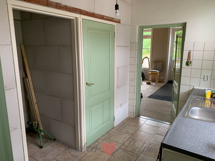 Vandaag worden de oude paneeldeuren op maat gezaagd voor de kozijnen en teruggeplaatst. We willen de oude deuren graag behouden omdat we ze mooi vinden maar het is voor de timmerman een hele uitdaging omdat ze allemaal zo krom zijn als een hoepel! Uiteindelijk lukt het toch om ze netjes in de kozijnen te plaatsen, maar misschien dat we ze uiteindelijk toch moeten vervangen door nieuwe. Maar eerst moet er in de keuken moet nog een tegelvloer gelegd worden, de wanden moeten gestuct worden, er moet een nieuwe keuken komen, de nieuwe bijkeuken moet netjes worden afgewerkt, etc. etc. Die oude paneeldeuren zitten voorlopig dus prima… ?
