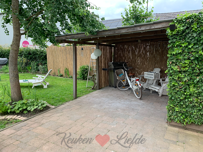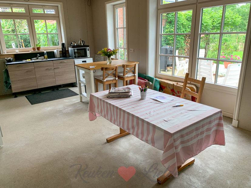 - Een oude tafel opgesnort uit de schuur zodat we – naast het eiland – een plekje hebben om te zitten.