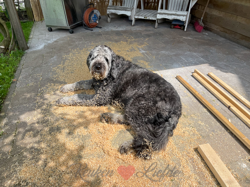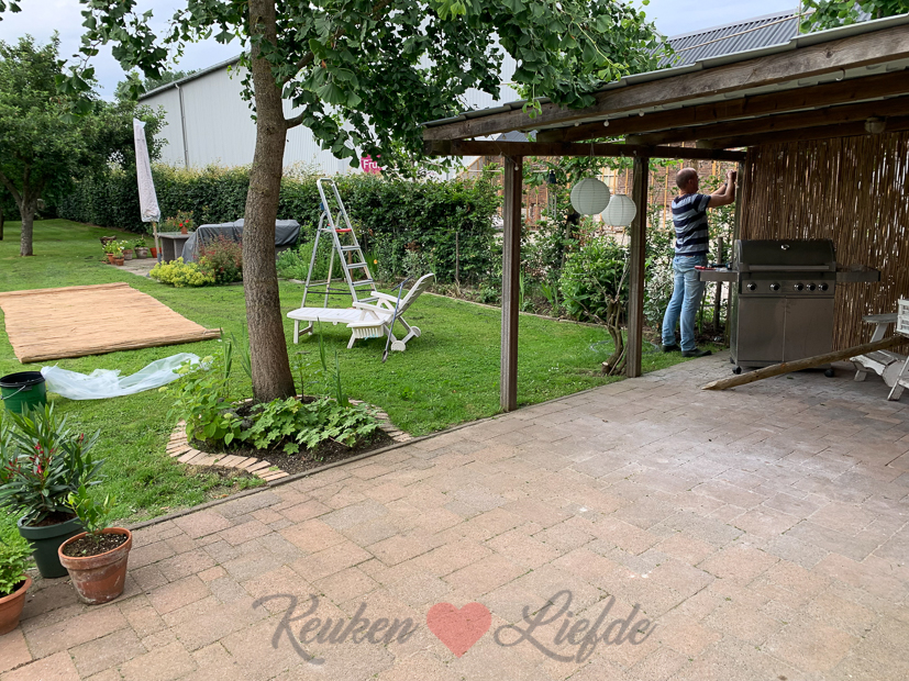 Ondertussen is Johan in de tuin aan het rommelen. Omdat de nieuwe beukenhaag tussen ons en de buren nog erg kaal is hebben we besloten er zolang rieten matten neer te zetten. Zo krijgen we toch een beetje privacy en krijgt de beukenhaag ook nog genoeg licht om goed verder te groeien.