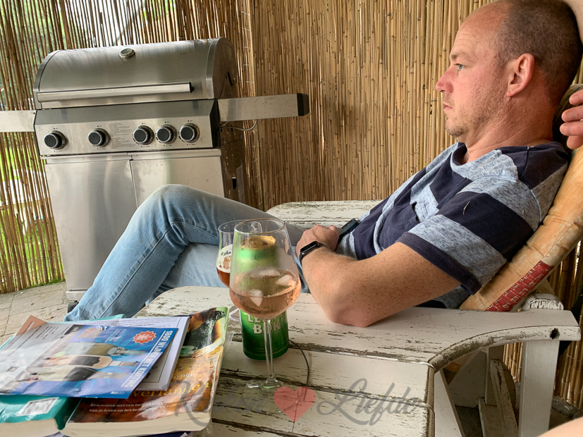 Aan het eind van de middag als we allemaal klaar zijn met onze werkzaamheden en net buiten willen gaan zitten met een drankje gaat het regenen. Dan maar even onder het afdakje zitten, want de temperatuur buiten is heerlijk.