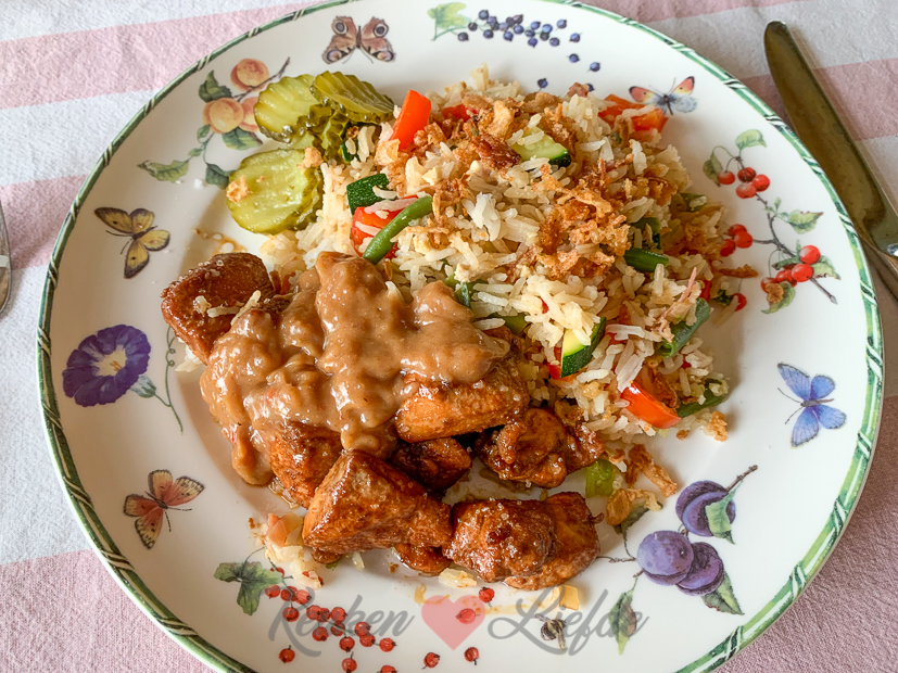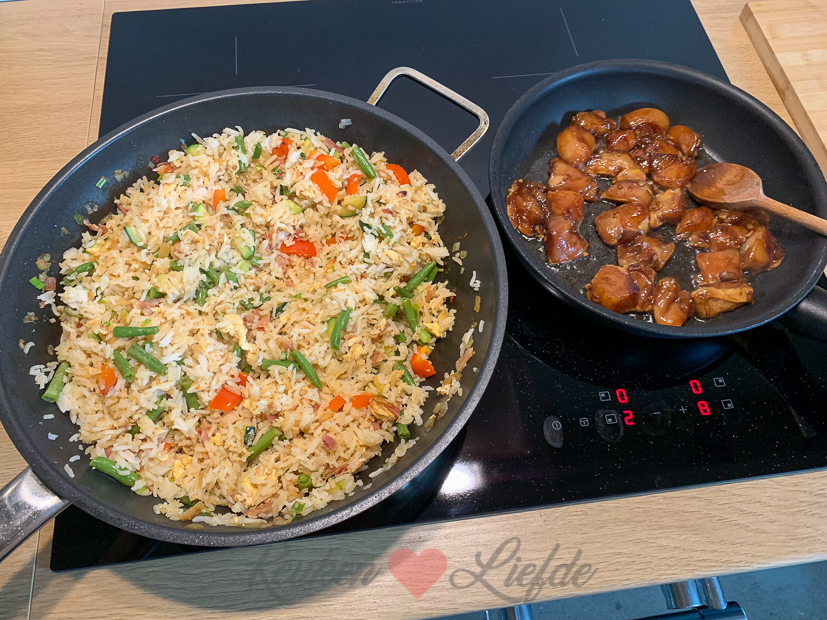 Omdat de gerechten die ik vandaag maakte al deels op zijn kook ik ’s avonds nog een keer. Ik maak nasi goreng met courgette uit de moestuin, paprika, lente ui, roerei en sperziebonen en erbij bak ik wat kip die ik eerder had laten marineren in satémarinade. Terwijl ik sta te koken zie ik dit tafereeltje als ik uit het keukenraam kijk…