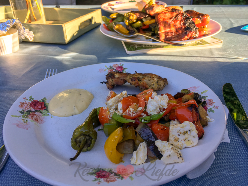 ’s Avonds gaan we barbecueën. Op de barbecue gaat een grote pan met groenten, worstjes, gemarineerde kippendijen, spareribs en erbij wat stokbrood en een tomatensalade met feta.