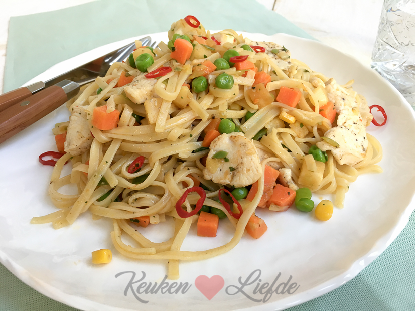 Langzaam probeer ik de vriezer leeg te maken die uitpuilde door alle kookboekdagen. Gisteren had ik er al kipfilet uitgehaald want vandaag maak ik bami met kip. Ik wilde er een zak Chinese roerbakgroenten doorheen doen die nog in de koelkast lag, maar die bleek over de datum te zijn. Even improviseren. Gelukkig vind ik in de diepvries een zak soepgroenten met blokjes wortel, knolselderij, prei, bloemkoolroosjes, doperwten en tuinkruiden. Perfect voor de bami. Lang leve een goedgevulde diepvries!