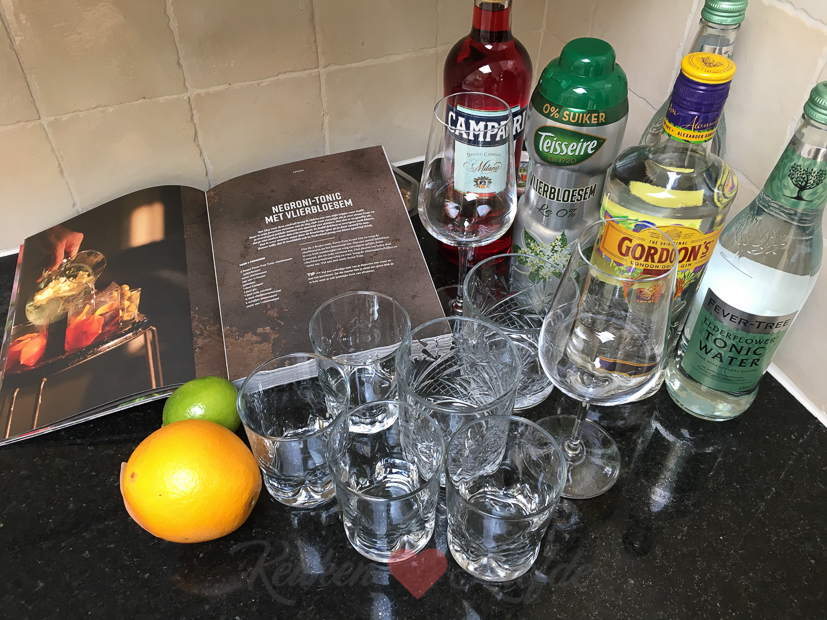 Als aperitief maak ik Negroni-tonic cocktails uit het kookboek Simple Food van Sergio Herman. Als diner serveer ik een grote borrelplank met allerlei lekkers en we sluiten de avond af met zelfgemaakte amandeltaart. Smullen!