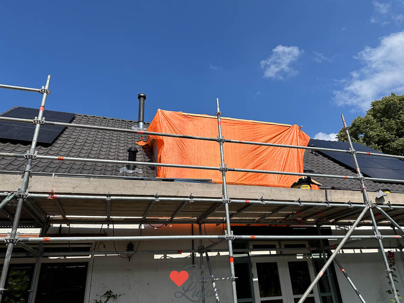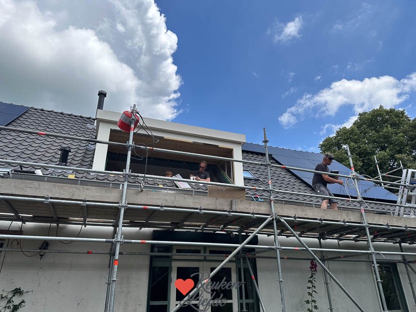 Ik stond ’s middags weer eens in de keuken om een makkelijk en lekker recept voor de website te maken: stokbrood caprese. Het recept staat inmiddels al online en vind je hier. Ondertussen zijn de mannen weer hard aan het werk op het dak. Vandaag worden de laatste puntjes op de i gezet want morgen wordt de steiger afgebroken. Het is lekker weer dus ’s middags springt de tiener nog even in het zwembad. Ondertussen klim ik gewapend met een emmer sop de steiger op om alle kozijnen en ramen schoon te maken. Voor het avondeten bakken we pannenkoeken.