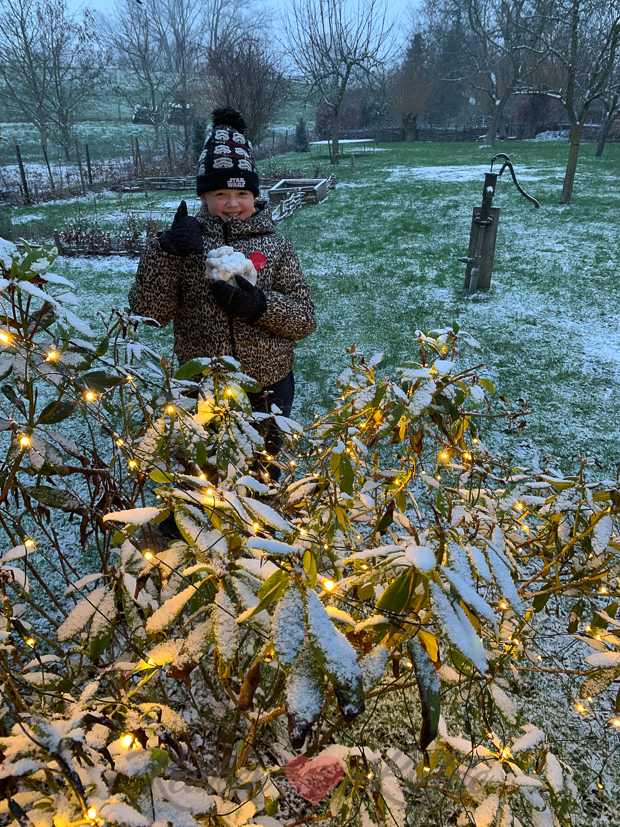 De volgende ochtend was Ella-Marie alweer vroeg in de sneeuw te vinden. Helaas was het hard aan het dooien en was het een papperige bende in de tuin.