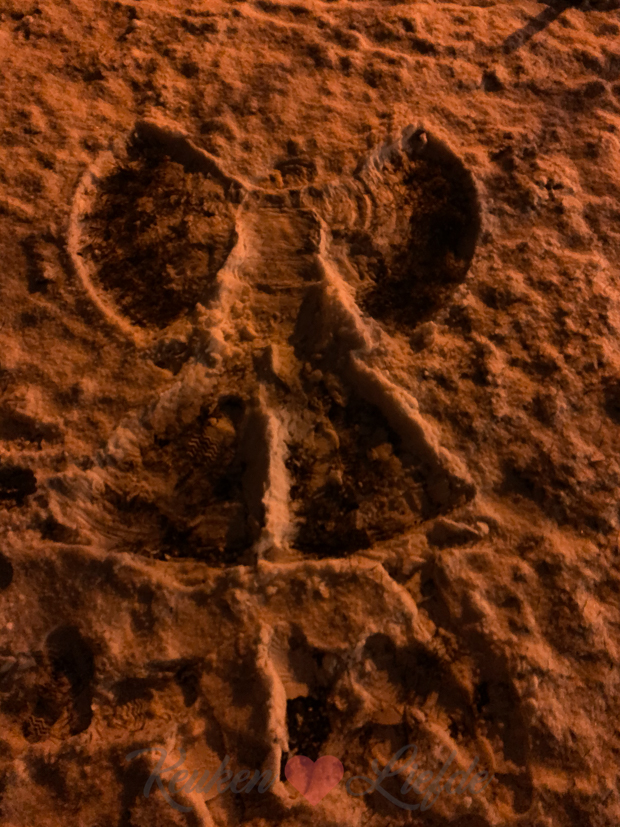Eind van de middag gaan we met z’n drieën wandelen met Nacho. Die wandelingen aan het eind van de middag zijn een verademing na een hele dag binnen zitten. Het begint net te sneeuwen als we weggaan. Ella-Marie vindt de sneeuwvlokken geweldig en moet overal even stoppen om sneeuw te verzamelen. Ik vond het vooral koud en kon alleen maar denken aan botermalse ribbetjes die op ons lagen te wachten voor het avondeten.