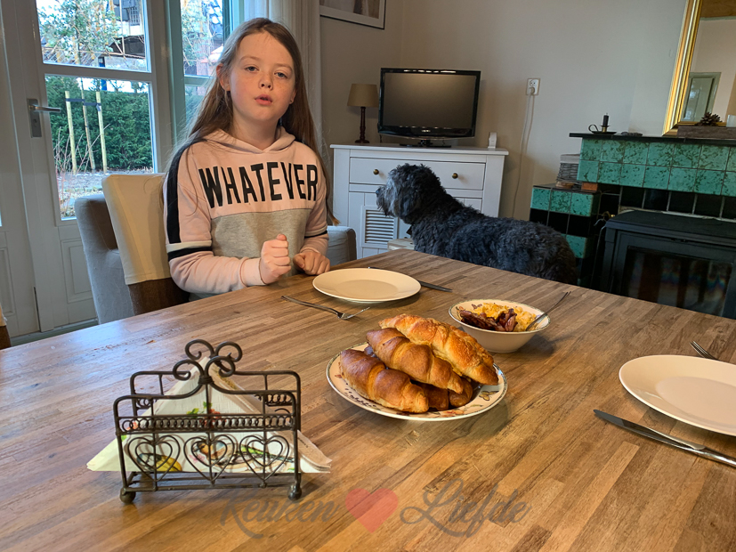 Ontbijten met croissants, roerei en uitgebakken spek.