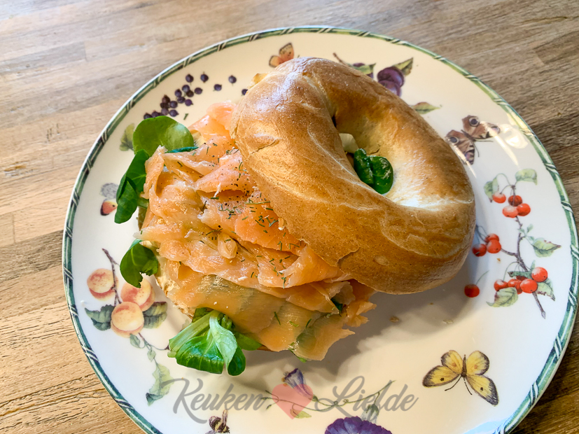 Lunchen met een bagel met roomkaas en zalm. Het betere werk!