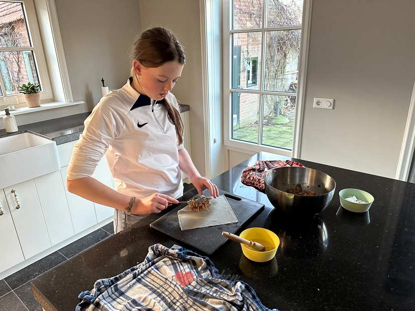 Met de loempiavulling die ik gisteren maakte kon ik 20 loempia’s vullen. In het pak loempiavellen dat ik had laten ontdooien zaten echter 40 loempiavellen en ik vond het zonde om daar niks mee te doen. Nadat ik ’s ochtends eerst weer even op kantoor werkte ging ik daarna snel een paar boodschappen halen om de overige loempiavellen te vullen. Gisteren maakte ik vegetarische loempia’s, vandaag maak ik een vulling met gehakt. Ook deze vulling is in een paar minuten gemaakt. Ik was net bezig met het rollen van de loempia’s toen Ella alweer uit school kwam. Die wilde het rollen ook weleens proberen en zo had ik plotseling hulp in de keuken. Tussendoor maakte ik ook nog een ander recept voor KL. Toen ik klaar was met fotograferen en het opruimen van de keuken was het alweer etenstijd. Ik ging dus maar gelijk door. Ik hoefde gelukkig alleen maar nasi op te bakken (ik had er een weeshuis mee kunnen voeden!) en serveerde de loempia’s erbij. Ik hoorde gelukkig niemand klagen. Zowel de vega loempia als de loempia met gehakt vielen hier erg in de smaak. We vonden ze zelfs lekkerder dan de loempia’s uit een kraampje!