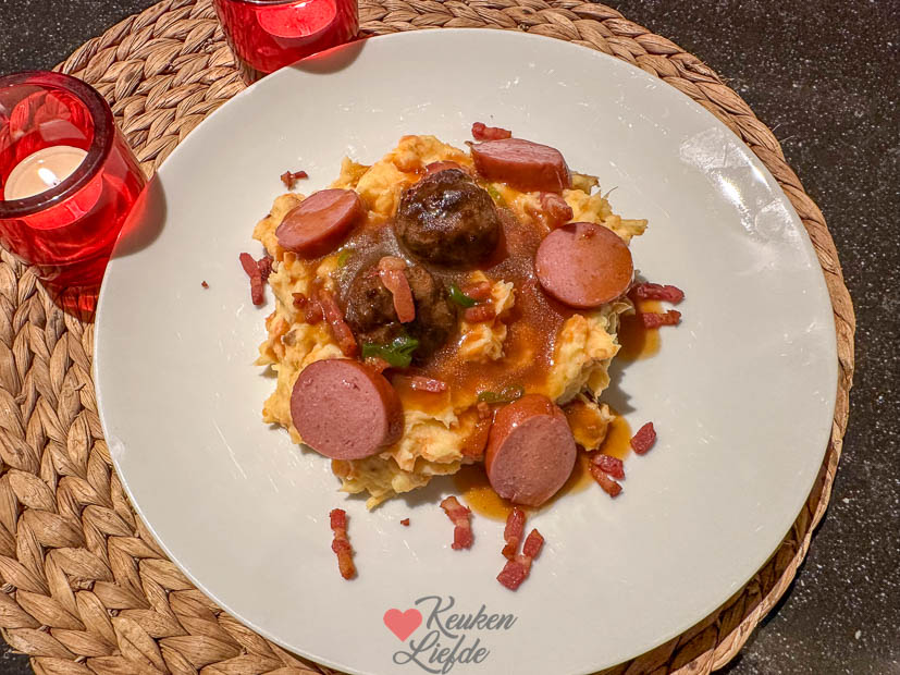 Het is een echte winterdag vandaag met heel veel (natte) sneeuw. Ik kreeg helemaal zin in hartverwarmende winterkost en besloot hutspot te maken. Ik serveerde de hutspot met jus, rookworst, uitgebakken spekjes en gehaktballetjes. Ook hier maakte ik een filmpje van om het recept met jullie te delen maar ook hier nog geen tijd voor gehad. Komt er z.s.m. aan!