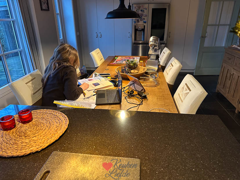 Mijn moeder stuurt ’s middags een foto door van haar lunch. “Ziet er goed uit moeders!”, stuurde ik terug. Mijn lunch was iets kariger maar ook lekker, ik maakte een tosti voor mezelf. Het was slecht weer dus had ik de tiener met de auto naar school gebracht. ’s Middags als ik haar ophaal gaan we meteen even boodschappen doen voor het avondeten. Al mijn voorstellen voor het avondeten werden afgeketst en uiteindelijk stelde ik voor om zelf pizzadeeg te maken voor zelfgemaakte pizza. Dat werd enthousiast ontvangen en weer thuis ging ik meteen aan de slag. Het pizzadeeg moet namelijk een tijdje rijzen. Ondertussen ging de tiener aan de keukentafel leren voor een toets.