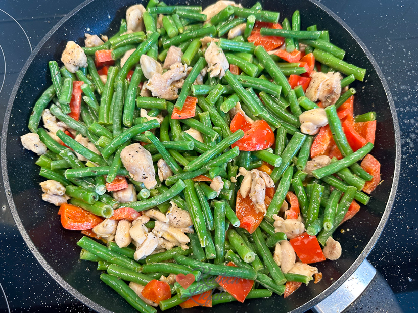 Vandaag is weer een gewone werkdag voor mij en Johan. Johan is de deur uit en ik heb een kantoordag thuis. Eind van de ochtend hebben Ella-Marie en ik een afspraak bij de kapper en daarna breng ik Ella naar de pont. Oma staat haar aan de andere kant op te wachten, want ze gaat gezellig logeren. Voor het avondeten flans ik voor Johan en mij een pastaatje in elkaar met van alles wat we nog in huis hebben. In de moestuin scharrel ik nog een courgette en sperziebonen bij elkaar. Voor de pasta bak ik een uitje met knoflook en wat fijngesneden bacon zachtjes uit, dan gaan er blokjes courgette, sperziebonen, champignons en een verkruimelde kippenbouillontablet bij, een scheutje water en even laten smoren tot groenten beetgaar zijn en het vocht verdampt is. Dan doperwten, flinke scheut slagroom, lepel crème fraîche en handje geraspte parmezaan erbij en even laten pruttelen. Op smaak brengen met peper uit de molen. Ondertussen pasta beetgaar koken, afgieten en door de saus roeren. Klaar in 15 minuten en altijd lekker.