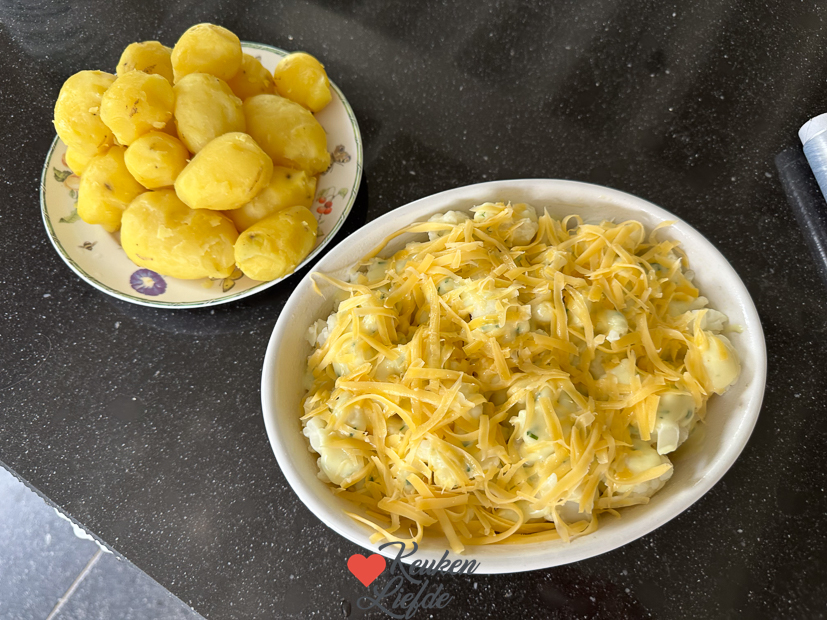 - 1,5 kg iets kruimige aardappel koken in de schil in gezouten water tot ze gaar zijn. Laten afkoelen en pellen. Verder laten afkoelen in de koelkast.