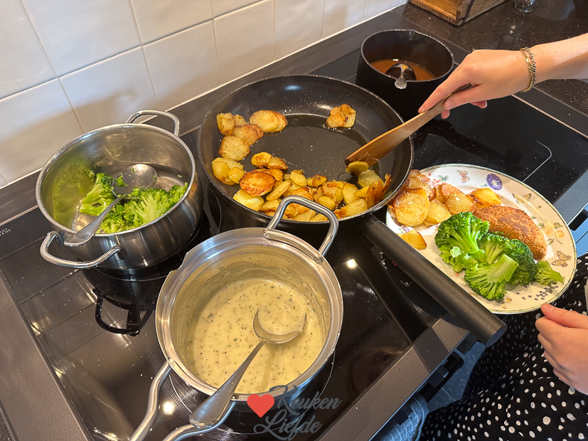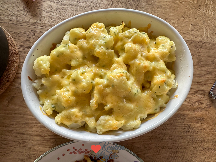 Mini me en ik hadden ’s middags tegelijk een afspraak bij de kapper in het dorp om te kleuren en knippen. Wel zo gezellig. 😃 ’s Avonds stond er een lekker asv’tje op het menu. Ik gaf er dit keer een iets andere draai aan en gratineerde de bloemkool met ham- en kaassaus en geraspte kaas even in de oven. Erbij gebakken aardappels, kip cordon bleu en jus.
