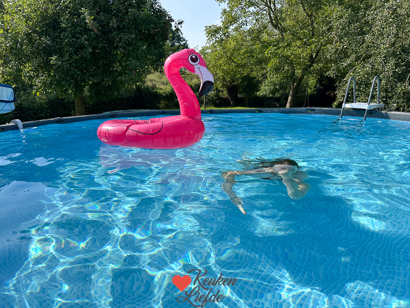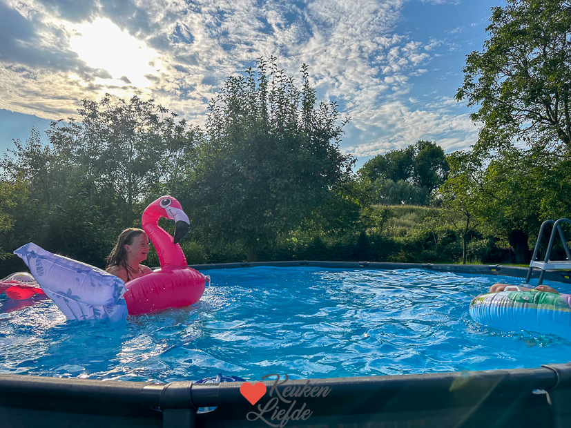 We hadden buiten de ventilator erbij gezet want het was windstil en met dik dertig graden niet te harden zo heet! Gelukkig konden neef en nicht lekker plonzen in het zwembad. ’s Avonds ging de barbecue aan en werd binnen een klein buffetje uitgestald. Na het eten moesten we snel buiten alles opruimen toen de wind, regen en het onweer de verstikkende hitte kwam verdrijven en zetten we het verjaardagsfeestje verder voort in de keuken. Ondanks de hitte, regen en het onweer was het weer erg gezellig! ❤️