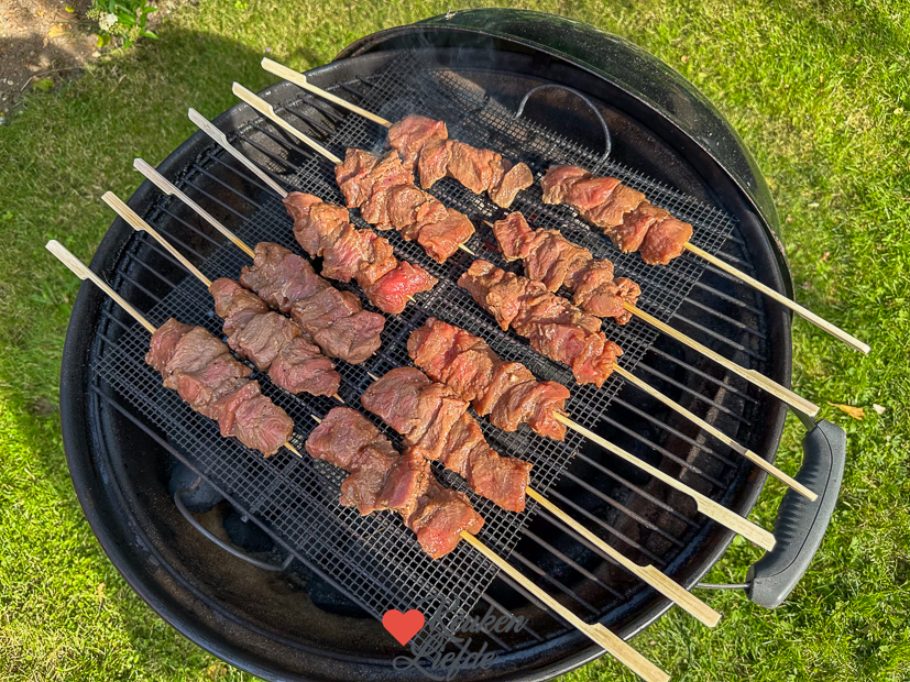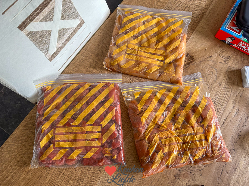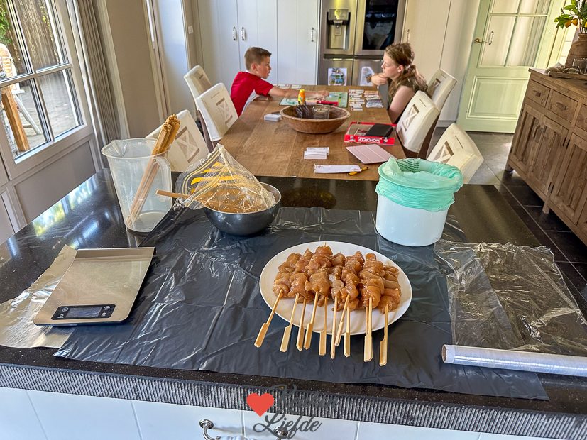 Vrijdagochtend brengt mijn zwager ons neefje Levi om gezellig een nachtje te logeren. Terwijl neef en nicht zich de hele dag (prachtig weer en dertig graden, joehoe!) vermaken met o.a. bordspelletjes, zwemmen en gamen ga ik verder met de voorbereidingen voor het verjaardagsfeest morgen. Zo marineer ik alvast het vlees zodat ik dat morgen alleen aan spiezen hoeft te rijgen. Ik gebruikte drie soorten vlees voor drie verschillende spiezen: