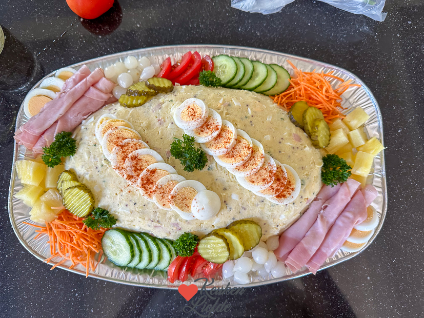 - 14 eieren hardkoken en pellen. Aardappels fijnstampen met pureestamper. Eieren fijnhakken en mengen met aardappel, fijngehakte peterselie, fijngesneden ham en smeuïg op smaak brengen met mayonaise, grove mosterd, zoetzuur augurkennat (geeft een lekkere frisse smaak), Maggie en zout en peper uit de molen. Normaal doe ik er ook gehakte zoetzure zilveruitjes door voor frisse smaak maar dat had ik nu niet gedaan.