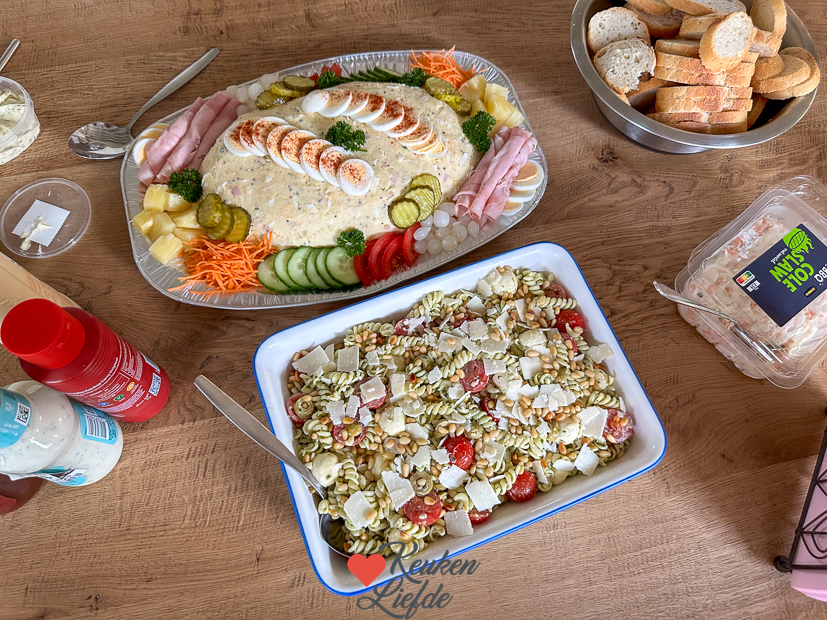 Vanaf half drie ’s middags is de familie bij ons welkom voor Ella’s verjaardagsfeest. Voor die tijd moet er nog wel het een en ander gebeuren. Na het ontbijt maakt Johan buiten de boel in orde en haal ik de slagroomtaart op bij de bakker. Daarna nog even het vlees aan spiezen rijgen, de aardappel-eisalade opmaken, pastasalade maken (pasta koken en laten afkoelen en mengen met verse pesto, mayonaise en zoetzuur augurkennat, zout en peper, cherrytomaatjes, mini mozzarellabolletjes en garneren met geroosterde pijnboompitten en parmezaan) en verse bloemen in huis zetten. Nog even snel douchen en niet veel later komt de familie binnendruppelen.