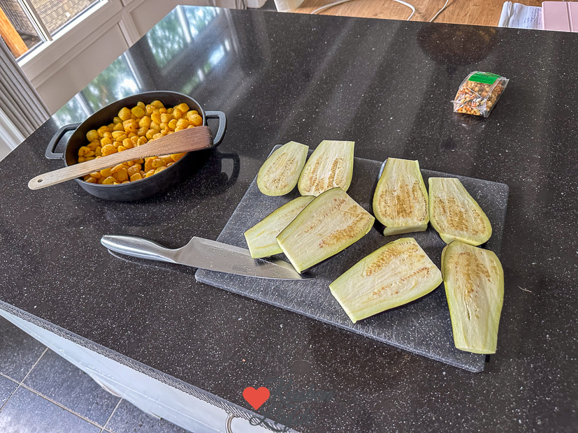 ’s Middags wordt er nog een lekker pakketje thuisbezorgd met o.a. jong belegen en oude Beemster kaas. Een pakketje naar mijn hart! 💛 Johan maakt ’s avonds weer een lekker maaltje van de barbecue met geroosterde aubergines, gebakken krieltjes en gegrilde hamburgers.