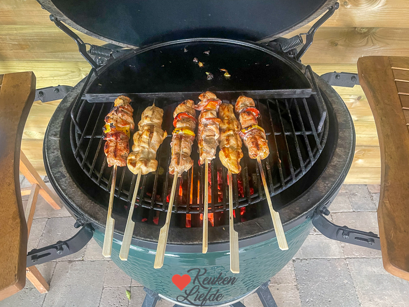 Alles mengen en in diepvrieszak in de koelkast minimaal 3 uur tot een nacht laten marineren. Met stukken paprika, rode ui en gerookt ontbijtspek aan spiezen rijgen.
