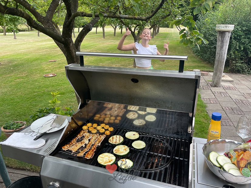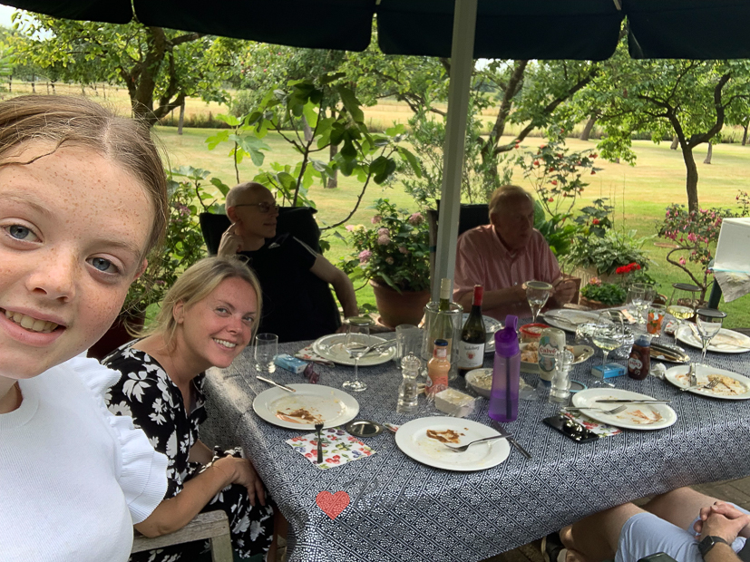 Eind van de middag rijden we naar mijn ouders om Ella op te halen en aan te schuiven voor een barbecue. Ik had het aardbeienroomijs dat ik op de kookdag had gemaakt (en had ingevroren) meegenomen als toetje.