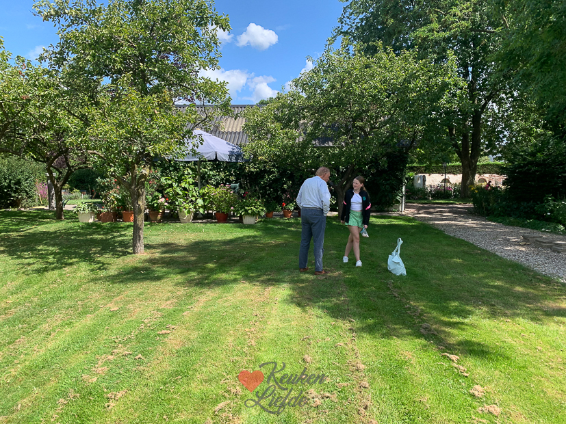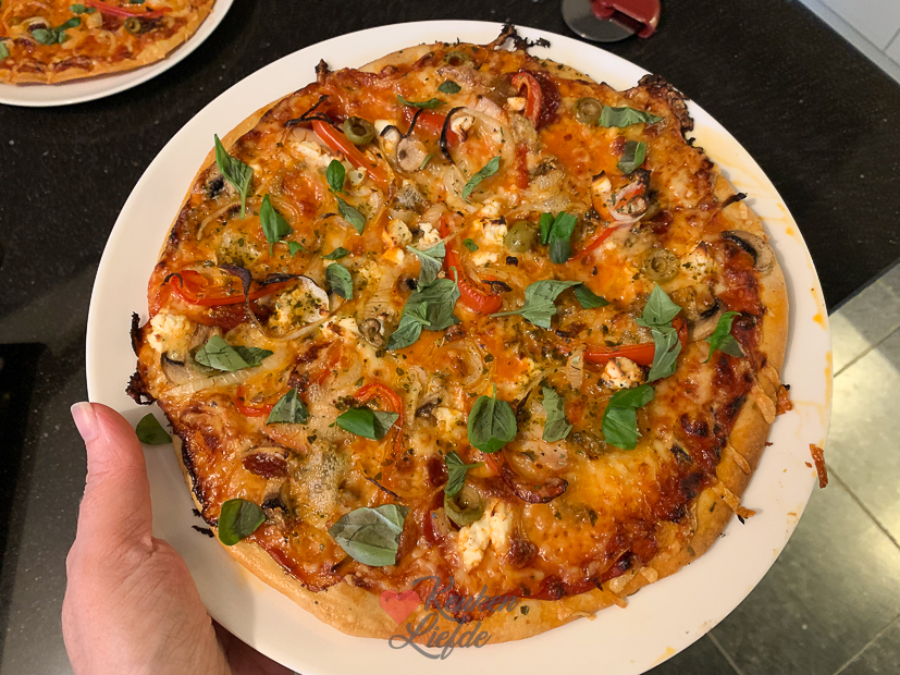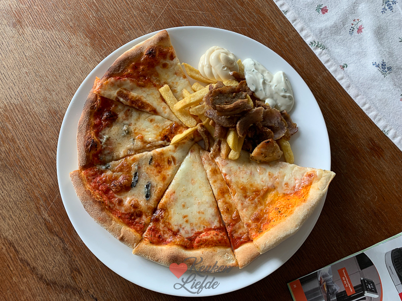 De tweede week van onze zomervakantie is ingegaan. Vandaag gaan we weer op pad om tegels uit te zoeken voor de keuken. We gaan in Beusichem kijken bij Rozendonk die Friese witjes verkopen en zijn het er snel over eens dat die het gaan worden. We gaan voor de ivoor mix met drie lichte basistinten die samen een rustig en mooi geheel vormen. Eenmaal thuis ga ik de keuken in om avondeten te maken. Met wat gevonden schatten uit de koel- en kelderkast maak ik een aantal pita pizza’s voor Ella-Marie en een pastaatje met courgette, aubergine en paprika in tomatenroomsaus voor Johan en mij.