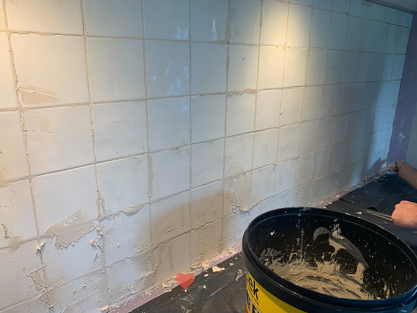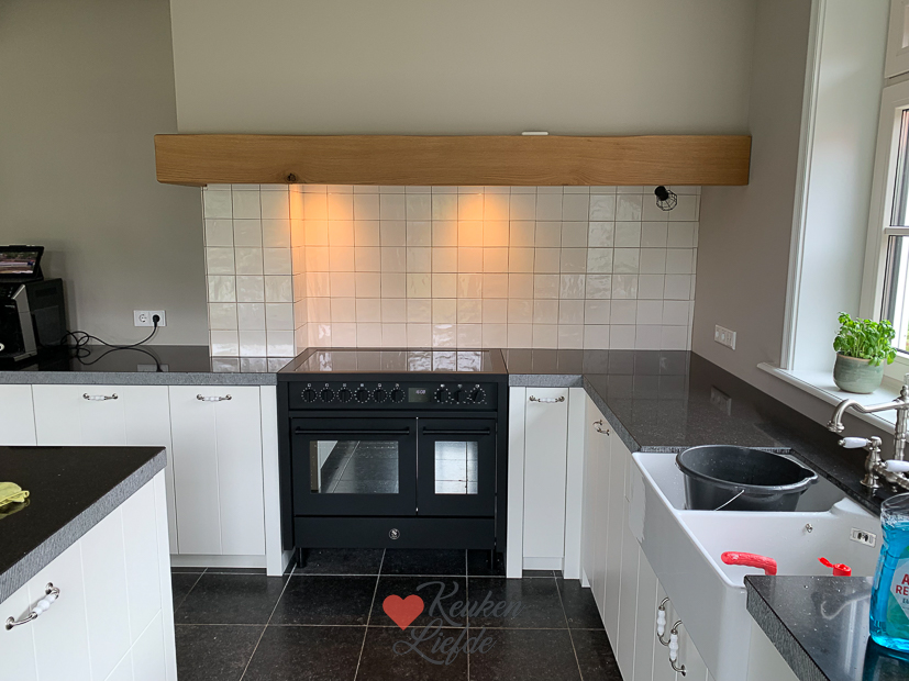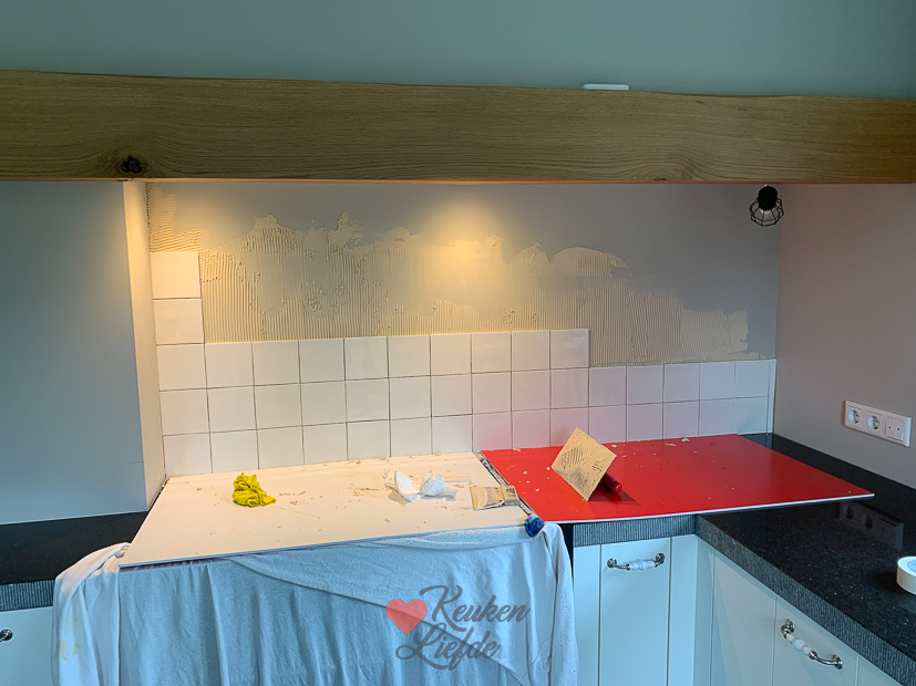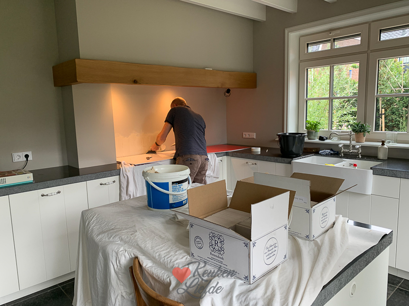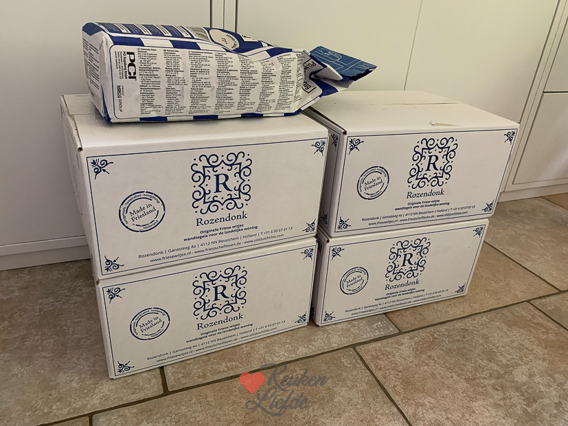 Nadat we wat filmpjes hebben bekeken verzamelen Johan en ik moed en beginnen aan de tegelklus in de keuken. We hadden allebei nog nooit getegeld dus we vonden het best eng om dit zelf te doen. Het moet natuurlijk wel mooi worden. Maar al gaande kregen we er schik in. Tegelen is best leuk. Aan het eind van de dag was de pap aardig op en besloten we eten thuis te laten bezorgen.