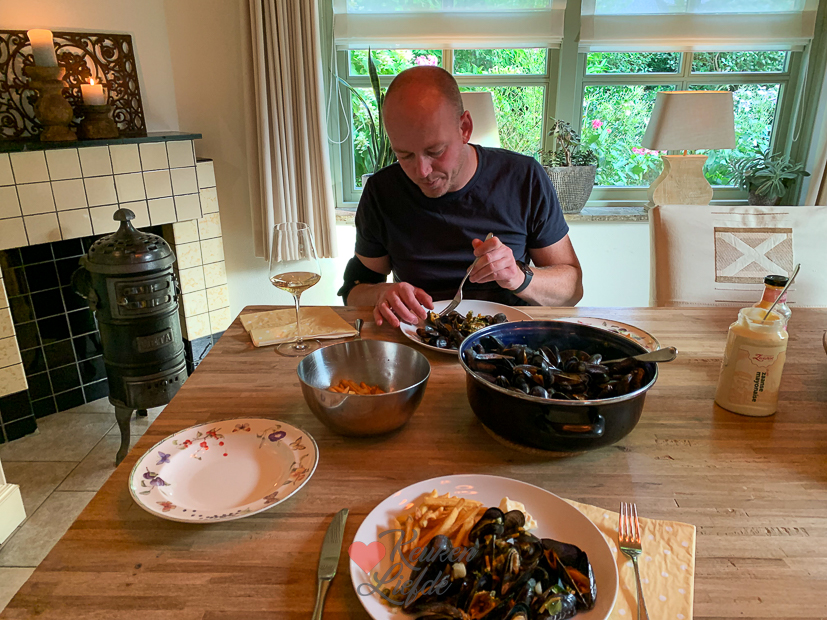 Vandaag heb ik een kookdag op de planning staan. De afgelopen twee weken heb ik niet gekookt en ik wil mijn voorraad recepten toch een beetje op peil houden. Johan rommelt ondertussen in huis en in de tuin en haalt in Beusichem de Friese witjes op. Als alle recepten gemaakt zijn en op de foto staan en de keuken is weer aan kant ga ik samen met Johan nog even de tuin in om wat te rommelen. Als we het zat zijn en onze maag begint te knorren gaan we samen de keuken in voor het avondeten. Er staan gekookte mosselen met frietjes op het menu.
