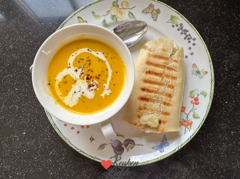 Omdat Ella van mening is dat we de vrijdag soepdag met panini’s traditie weer in moeten voeren maak ik voor het avondeten verse pompoensoep met geitenkaas-hampanini’s.